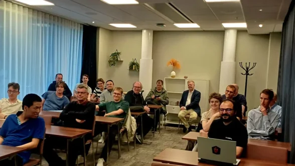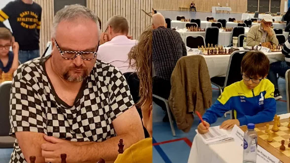 Jan Lundin tar emot Ståhlbergplaketten från Albin Ringstad. ”Passande”, säger han. ”Jag spelade Ståhlbergs variant, den svenska varianten i Tarrasch, i en rond.”