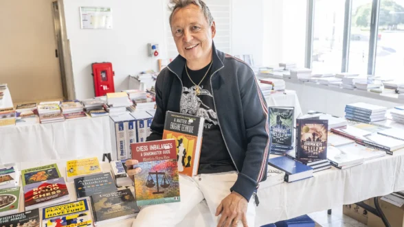 Ari är passionerad kring schack och schackböcker och har inga problem med att tipsa om ett par relevanta och aktuella titlar under Schack-SM i Uppsala, dit han forslat större delen av sin butik.