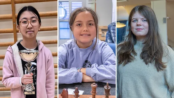Svenska truppen består av nio spelare i Flick-NM i schack som avgörs 24–26 april. Foto: Johanna Lundström, Emilia Horn och Lars OA Hedlund