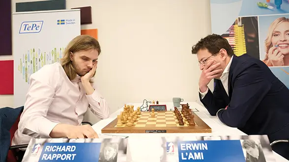 Högst rankad i tävlingen är Richard Rapport och han visade varför genom en seger mot Erwin l’Ami. Det höll sig länge jämnt materiellt men det var Rapport som tryckte på. Till sist tvingade hans många fribönder l’Ami att ge upp.