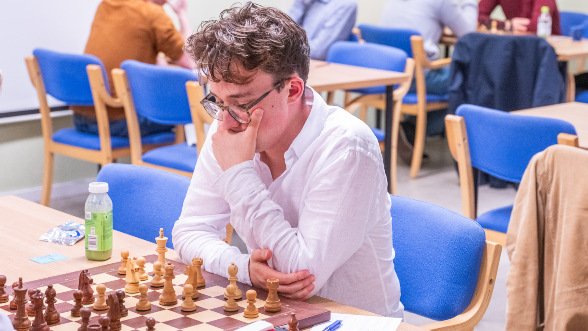 Tiger Hillarp hade vid seger som vit mot FM Das Priansh, anslutit sig till tätklungan. Han var inte nöjd med hur partiet artade sig inledningsvis. Men kunde enligt egen utsago i kommentatorsrummet efter partiet andas ut efter 17… Sb4, som släppte trycket på d4-fältet. Efter mycket om och men, så blev det ett remislut ändå.
