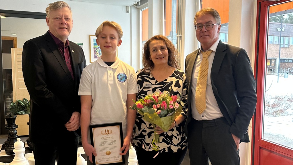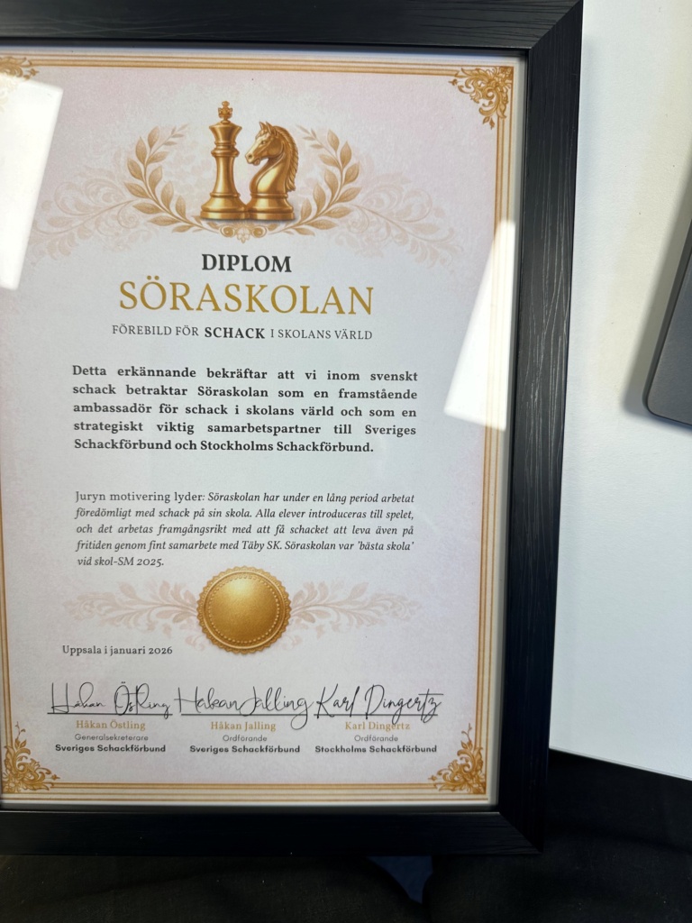 En delegation bestående av Håkan Östling, Generalsekreterare och Karl Dingertz, ordförande i Stockholms Schackförbund, tillsammans med Ofelia Thörnqvist, skolschackansvarig och Jan Engfeldt från Täby SK besökte på torsdagen Söraskolan i Åkersberga (i Österåkers kommun), och överlämnade det inramade diplomet och en liten blomsterkvast.