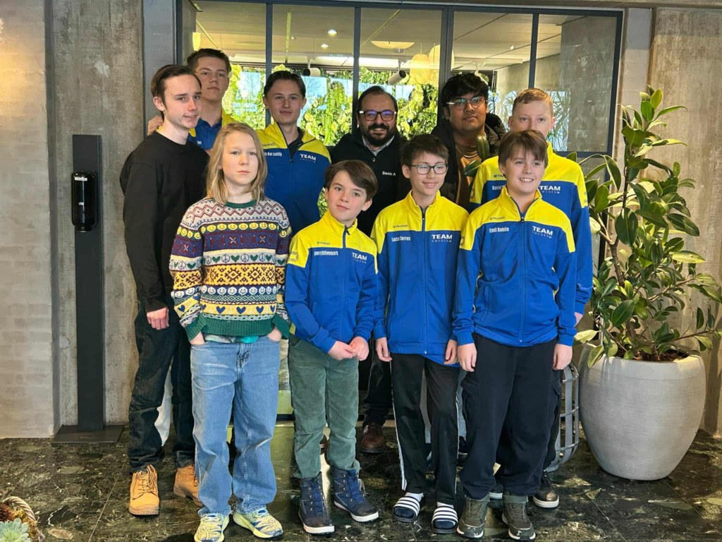 Det svenska Skol-NM laget utanför spellokalerna i danska Fredericia. På bilden saknas Marek Religa. Främre raden från vänster till höger: David Lark, Georg Olivemark, Lucas Torres och Emil Dahlin. Bakre raden från vänster till höger: Oliver Wedenberg, Vidar Seiger, Melvin Ral Lustig, Deniz Arman (ledare), Pratyush Tripathi och Daniel Bergdahl. Foto: Karin Arenås