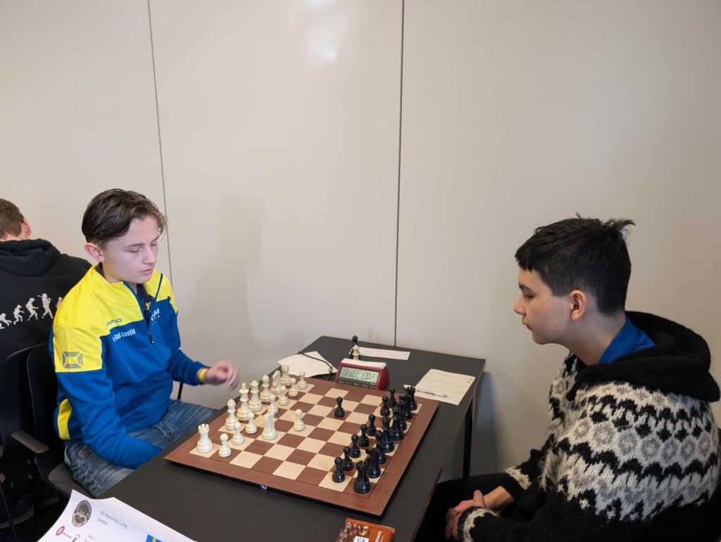 Melvin Ral Lustig, till vänster, som vit i segerpartiet mot Josef Omarsson från Island i den näst sista ronden. Melvin blev tvåa i Skol-NM för Klass C, allstå spelare som blir 14 eller 15 år under 2026. Foto: Deniz Arman