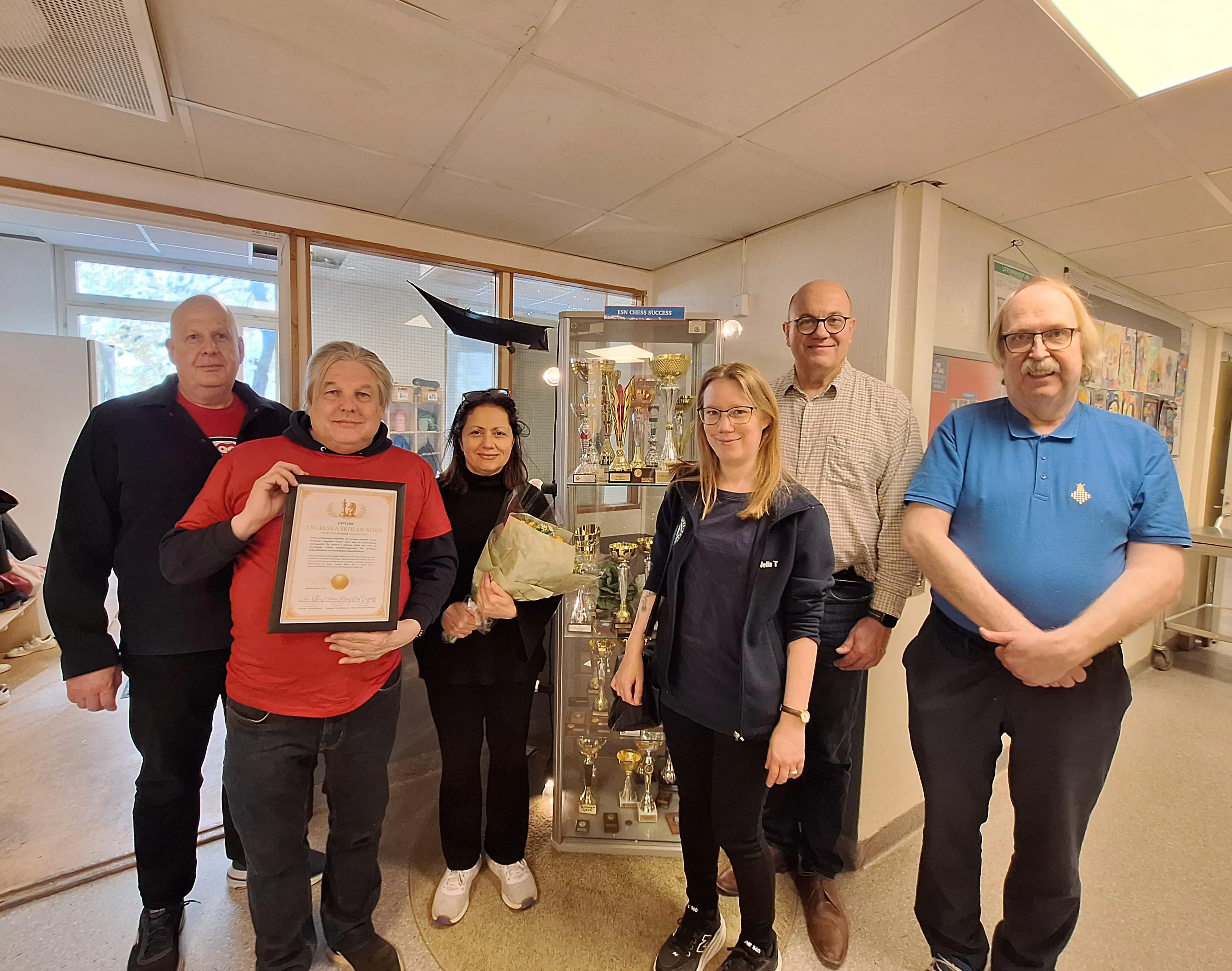 Engelska Skolan Norr har i många år haft en stolt schacktradition, med framgångar inom Schackfyran, Yes2Chess, Skollags-SM med mera. Under tisdagen uppmärksammades skolan med blommor och diplom då Jonas Sandbom och Mikael Sandberg från Stockholms Schackförbund och Ofelia Thörnqvist från Sveriges Schackförbund. Delegationen mottogs av rektor Lubna Irfan, matematikläraren Colin McGowan som varit en nyckelperson i schacksatsningen, samt schackprofilen John Löfgren som är anställd som schackpedagog på skolan. Därmed sällade sig skolan till skaran av framstående schackskolor som blivit diplomerade av Sveriges Schackförbund.