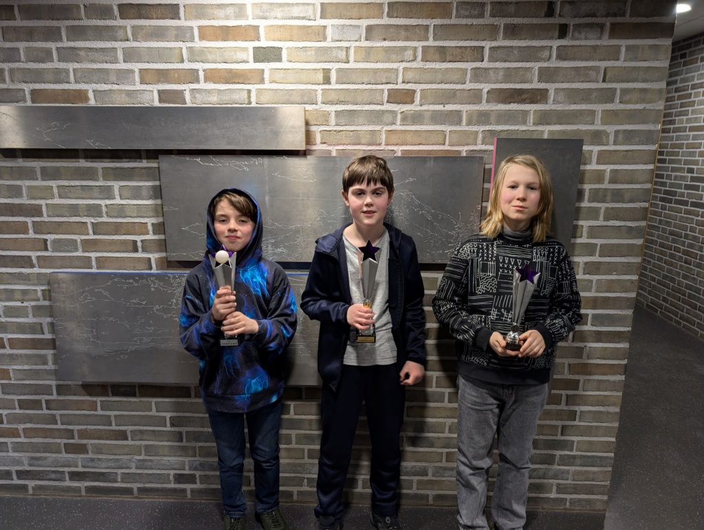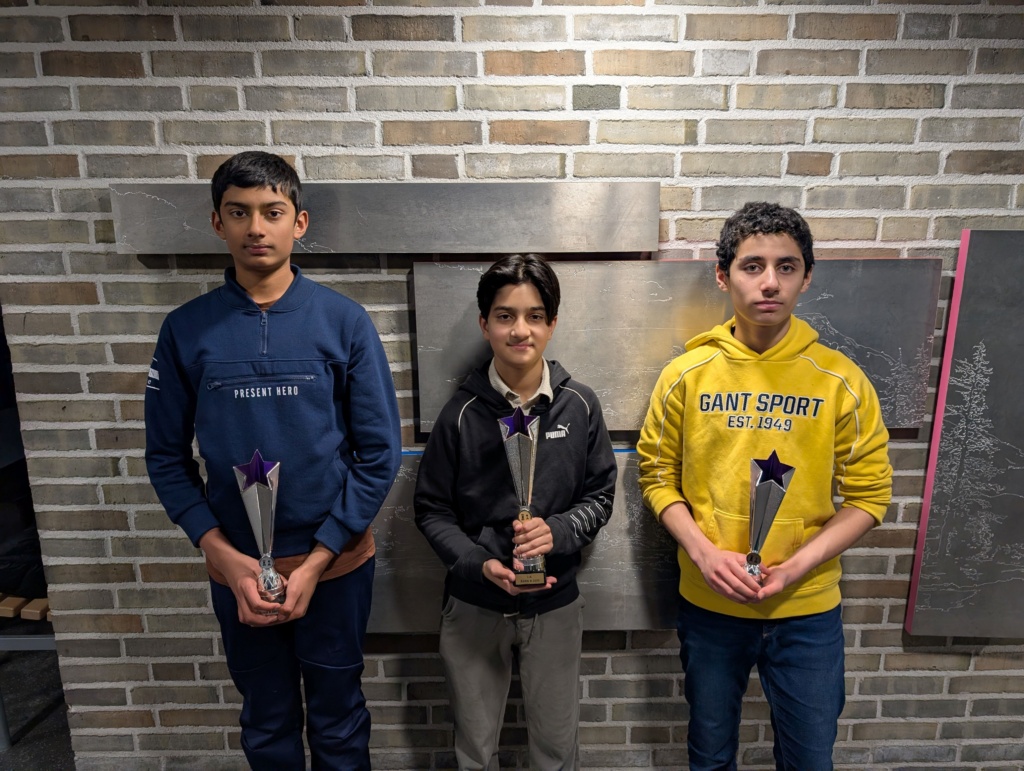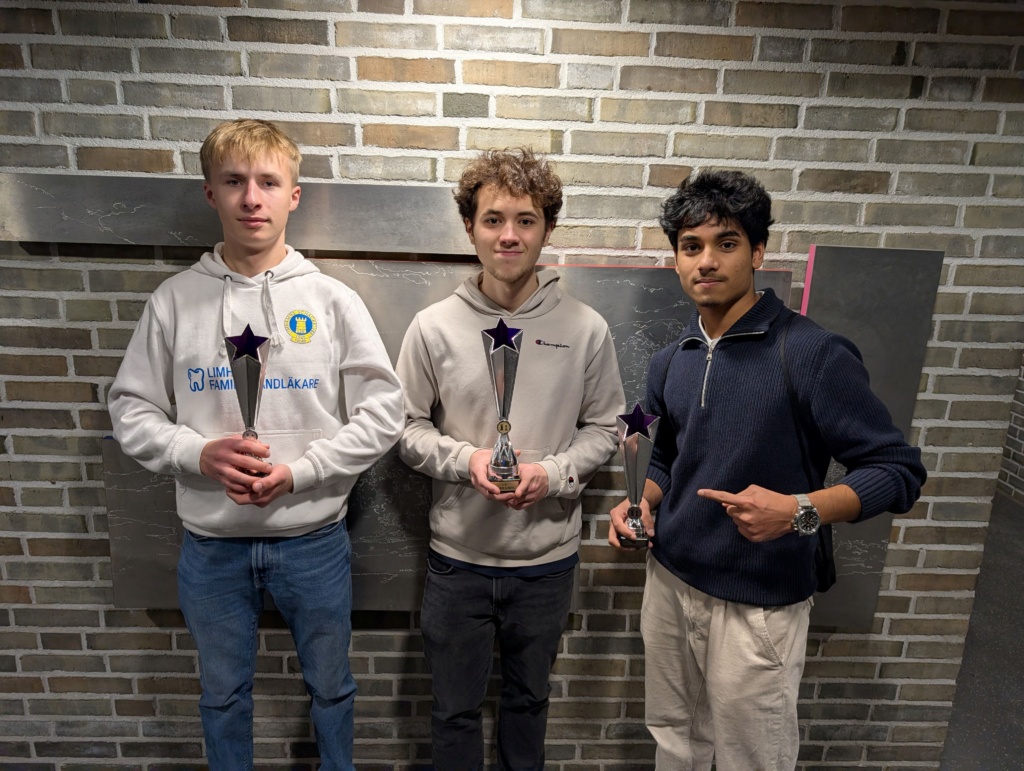 Segraren Mattias Langhals i juniorklassen (ÅLen A) i mitten, är flankerad av tvåan till vänster i bild (Svetoslav Reinsch) och trean till höger (Jaittresh Venkkata Sunkara). Foto: Aron Lidé