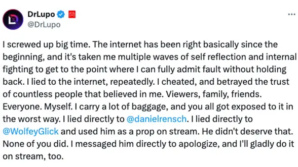 DrLupo själv förnekade alla fuskanklagelser, men överbevisad fick han så småningom krypa till korset och skrev på X: