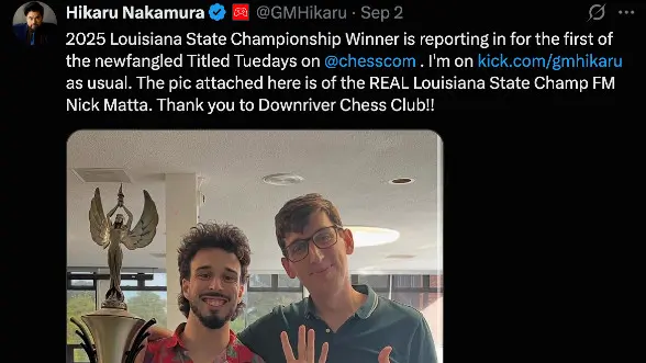 Hikaru Nakamura åkte till Louisianas delstatsmästerskap som ett delmål för att tillgodose världsschackförbundet FIDE:s krav på att han måste uppvisa aktivitet i långpartier för att få den där ratingplatsen till Kandidatturneringen. Totalt åtta tar sig dit via olika kvalificeringar, och vinnaren där får spela en VM-match mot regerande världsmästaren D Gukesh, Indien