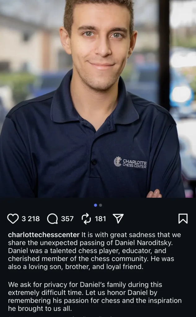 Det är med stor sorg som schackklubben Charlotte chess center meddelar att Daniel Naroditsky plötsligt och oväntat dött i en ålder av bara 29 år. Ingen dödsorsak har angetts. Hans familj skriver i ett pressmeddelande:
