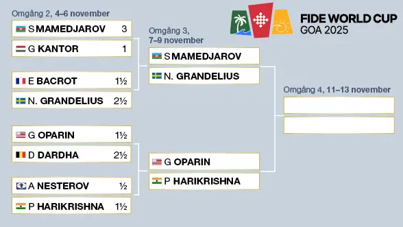 Nils Grandelius är vidare till den tredje omgången i FIDE World Cup i Goa, Indien. Det står klart efter matchseger i tiebreak mot fransmannen Etienne Bacrot.
