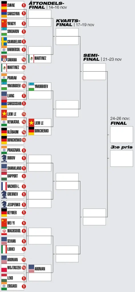 Här är slutspelsträdet inför onsdagens avgörande i fjärde omgången. Det är värt att notera Indiens ”skuffelse” hittills i denna tävling på hemmaplan. Landets stjärnor Nihal Sarin och världsmästaren D Gukesh är redan utslagna. Och på onsdagen försvann också Pranav Anand och Karthik Venkataraman.