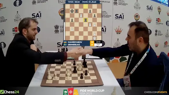 Det första matchpartiet i FIDE World Cup i Goa mellan Sverigeettan Nils Grandelius och Sjahrijar Mamedjarov slutade remi. Nu fortsätter matchen i den tredje omgången på lördagen när duellanterna möts igen, och då har Mamedjarov de vita pjäserna.