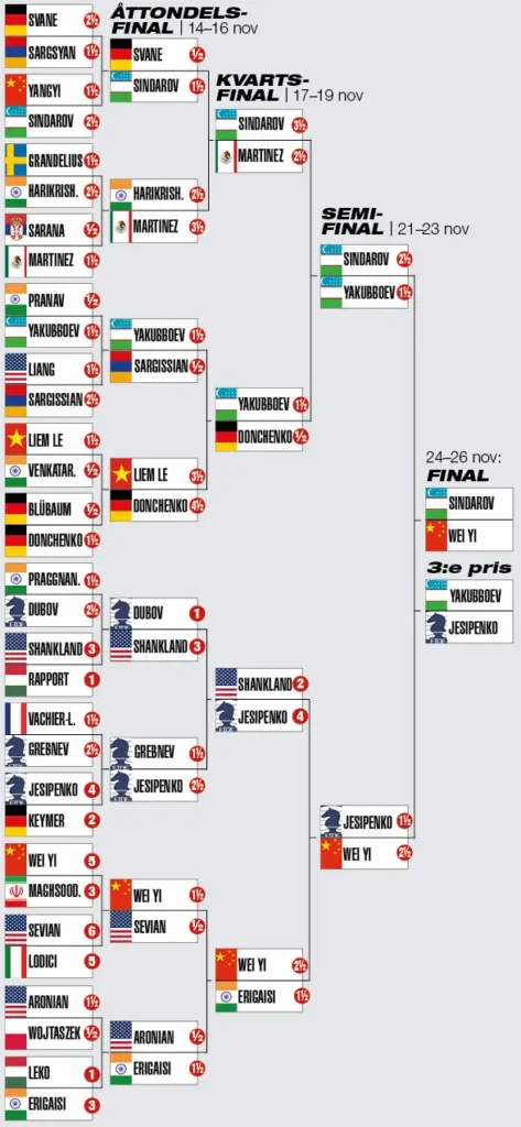 Båda dessa har med finalplatserna kvalat in till Kandidatturneringen. Den tredje biljetten går till den som vinner matchen om tredje priset: Andrej Jesipenko eller Sindarovs landsman Nodirbek Yakubboev.