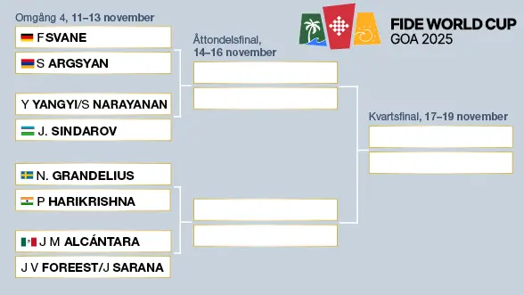 Världsmästaren själv, D Gukesh, som ville testa krafterna här i World Cup åkte på en smäll mot tysken Frederik Svane. Och när även åttondeseedade Nodirbek Abdusattorov förlorade mot mexikanaren ser plötsligt Grandelius lottningshalva fullt mänsklig ut.