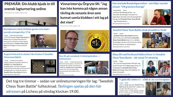 Några rubriker från svenska lagtävlingen som spelades online under pandemiåren.