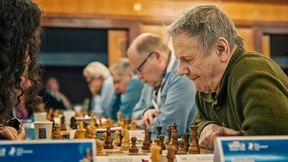 Ulf Andersson under sitt vinstparti mot Tjeckiens Olga Sikorova i veteranernas lag-VM i Prag. Foto: Peter Kranzl/wstcc2025.net